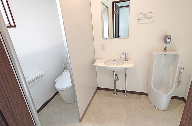 1階:冷暖房エアコン(事務室・応接室) / 瞬間湯沸器(給湯室) / 男女別トイレ、シャワートイレ付き