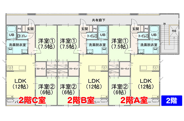 2階:2LDK(LDK12帖、洋室7.5帖・6帖)