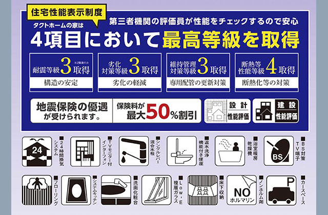 東北電力、公営水道、オール電化(IHクッキングヒーター、エコキュート370L)、本下水、システムキッチン、1F・2Fウォシュレット、シャワー付き洗面化粧台、ペアガラス、浴室乾燥機付ユニットバス、高性能樹脂窓(Low-E複層ガラス)外構、カースペース